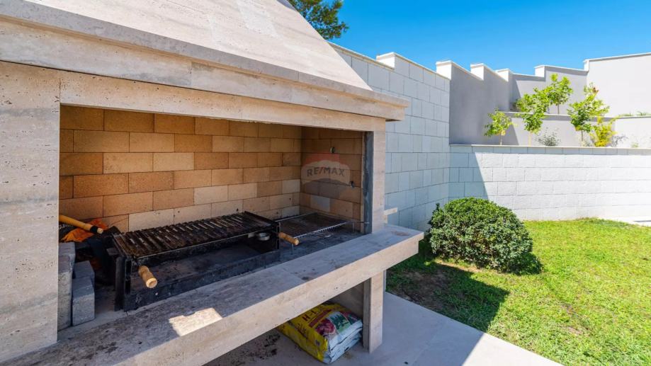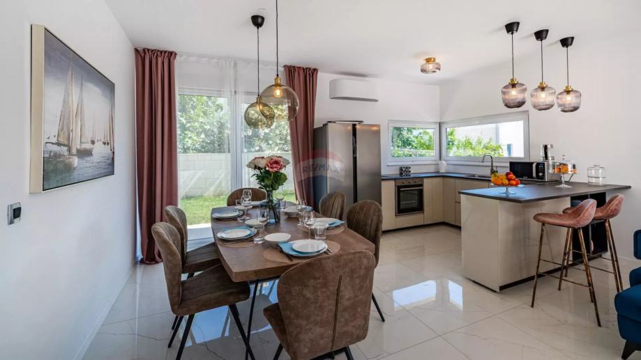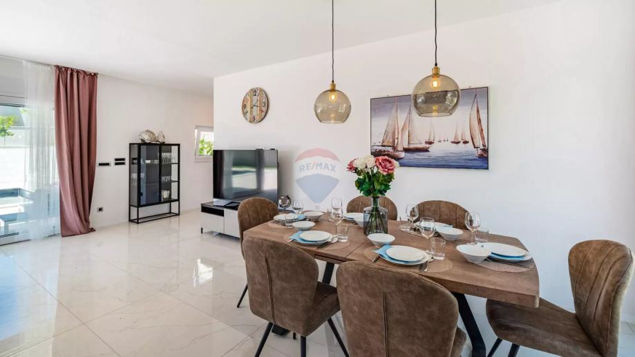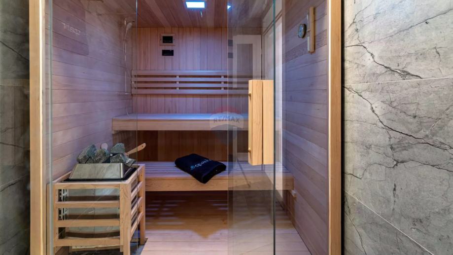 U prizemlju se nalazi open space kuhinja sa blagovaonom i dnevnim boravkom s izlazim na prekrasnu terasu i bazen, idealno za opuštanje i uživanje, spavaća soba, kupaonica sa saunom, fitnes prostorija i prostor prilagođen djeci.