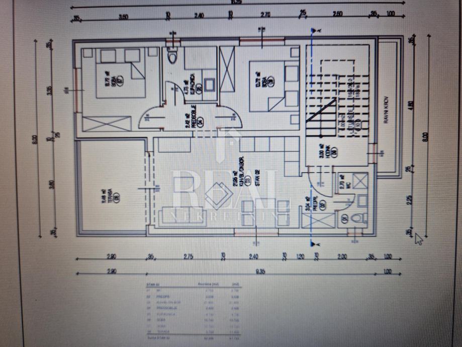 Nekretnina je kvalitetno građena i biti će opremljena kvalitetnom vanjskom stolarijom s roletama i komaricama, klimom, termo fasadom,i kvalitetnim podnim i zidnim oblogama i dr.