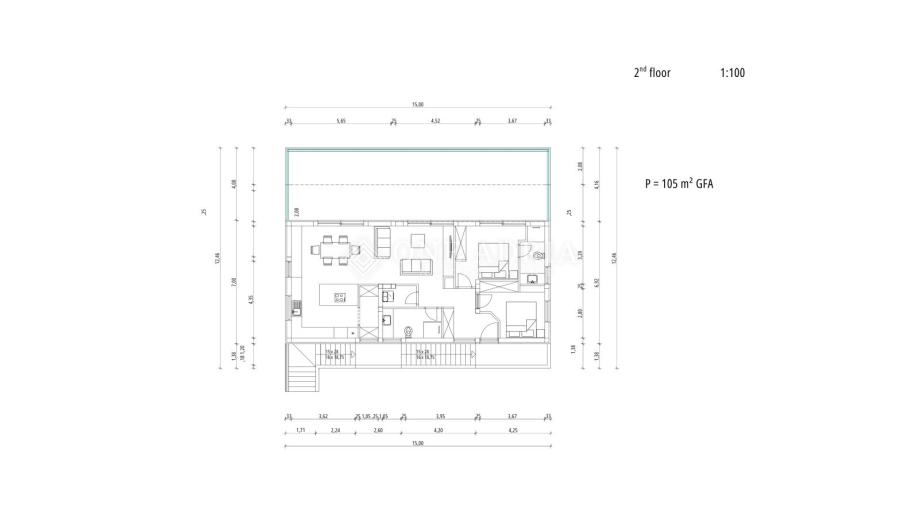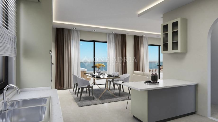 Prodaje se ekskluzivan penthouse stan površine 134 m², smješten na drugom katu stambene zgrade moderne gradnje. Ovaj jedinstveni stan odlikuje se vrhunskim dizajnom, prostranom terasom s jacuzzijem i impresivnim panoramskim pogledom na more. Zahvaljujući uvučenom vanjskom zidu, terasa je djelomično natkrivena, što omogućuje uživanje u vanjskom prostoru tijekom cijele godine.