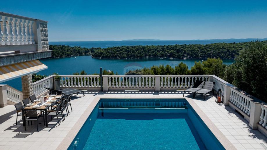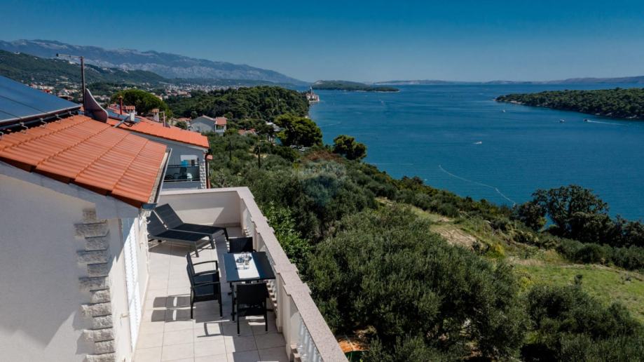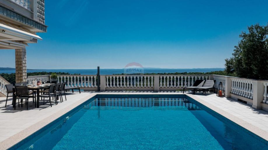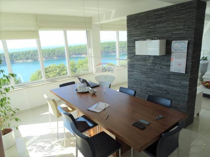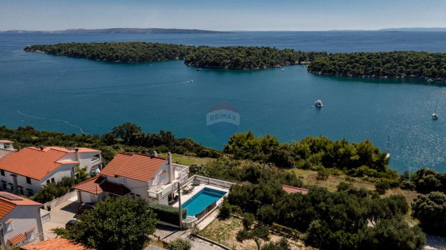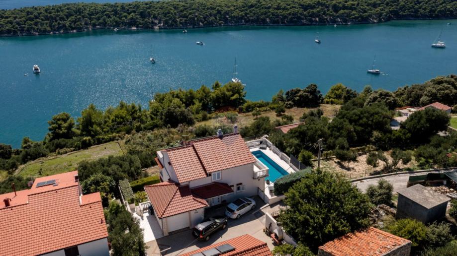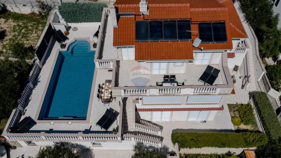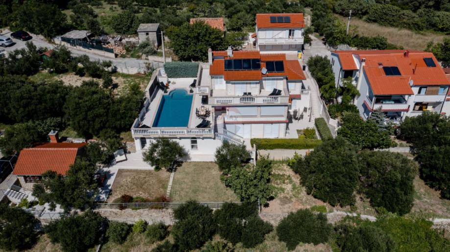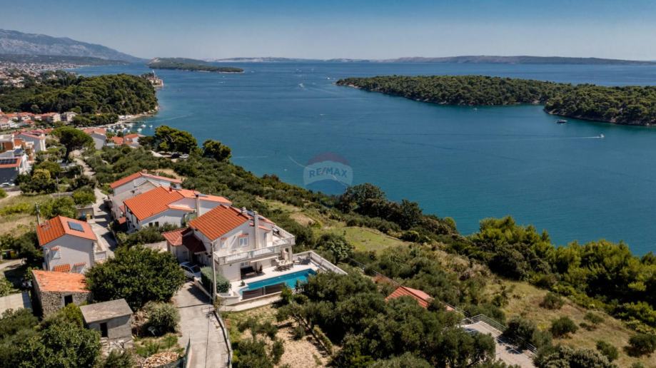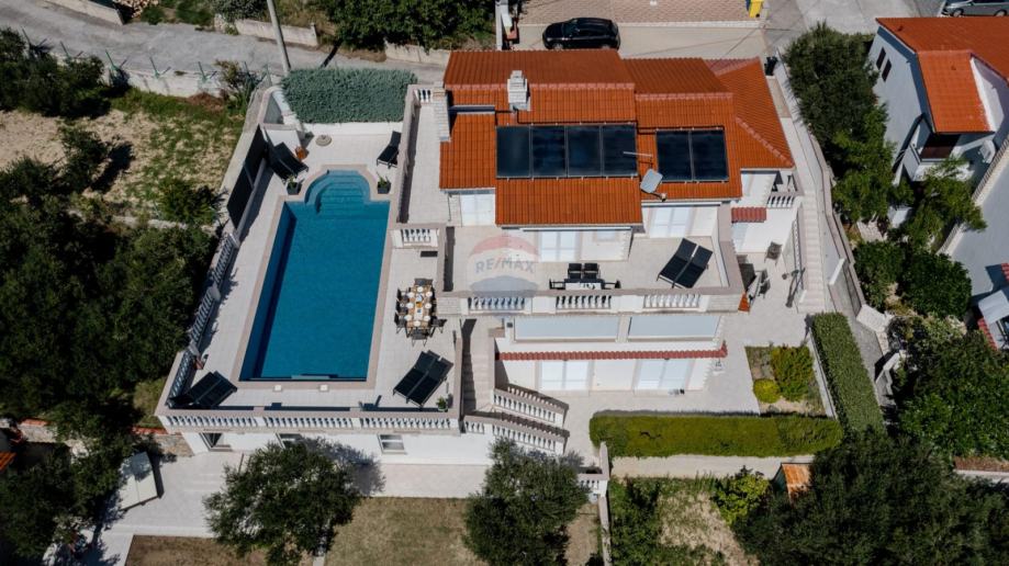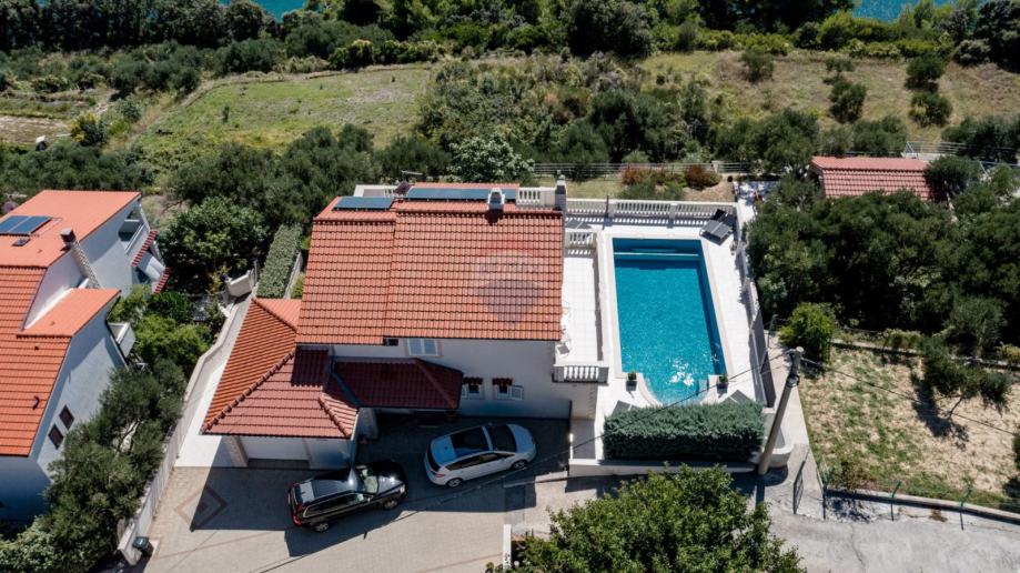 Kuća se nalazi se iznad mora, a sastoji se od tri etaže i lijepe, uređene okućnice. U suterenu je jednosobni stan sa zasebnim ulazom, a sastoji se od dnevnog boravka, vinoteke, vešeraja, kotlovnice, teretane i kupaonice. U prizemlju je također jednosobni stan s dnevnim boravkom - cijela južna strana je ostakljena te je pogled impresivan. Unutrašnje stepenice vode na prvi kat gdje se nalaze tri sobe s kupaonicama i otvorenom terasom površine 70m2.