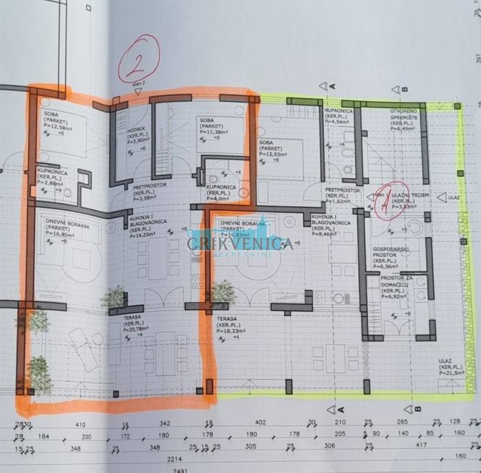 Stan 2 - hodnik, dvije kupaonice, dvije spavaće sobe, dnevni boravak, kuhinja, blagovaona te terasa (20,78m2).
