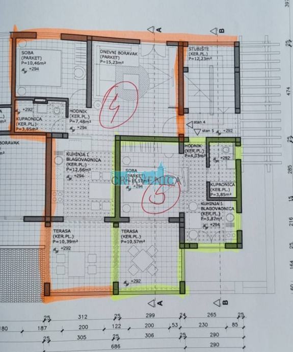 Veličina stana je 88,61 m2 sa dva parkirna mjesta. Cijena stana iznosi 277000€ PRODANO