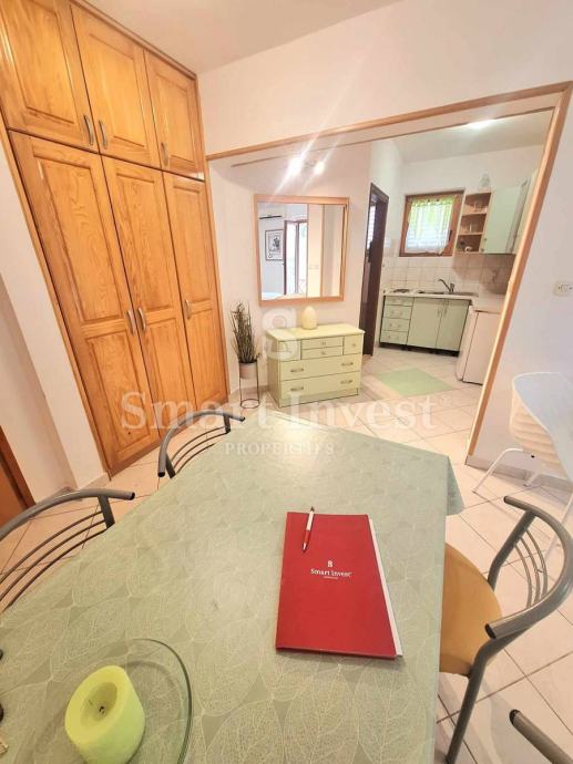 Prvi apartman površine 39 m2 smješten je na prizemlju ( s južne strane visina 1. kata) a sastoji se od otvorenog prostora kuhinje, blagovaonice i dnevnog boravka, kupaonice, spavaće sobe i balkona. Uređen i namješten, redovno održavan.
