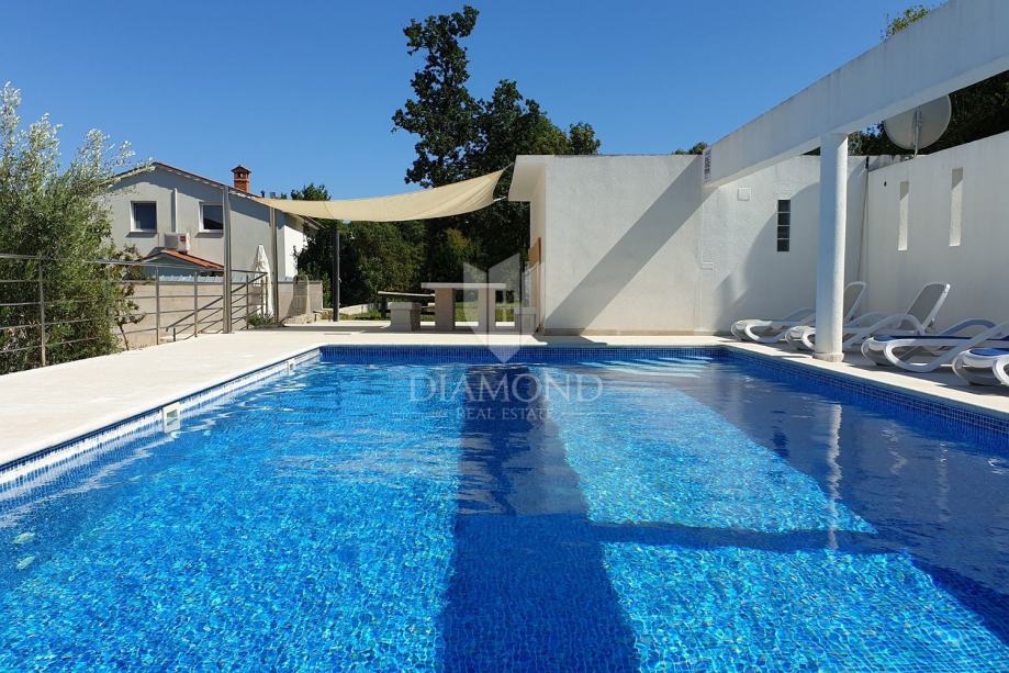 Okućnica je uređena i obuhvaća bazen površine 50 m² sa sunčalištem. Na okućnici se također nalazi pomoćni objekt s garsonijerom i terasom te spremištem s posebnim ulazom.