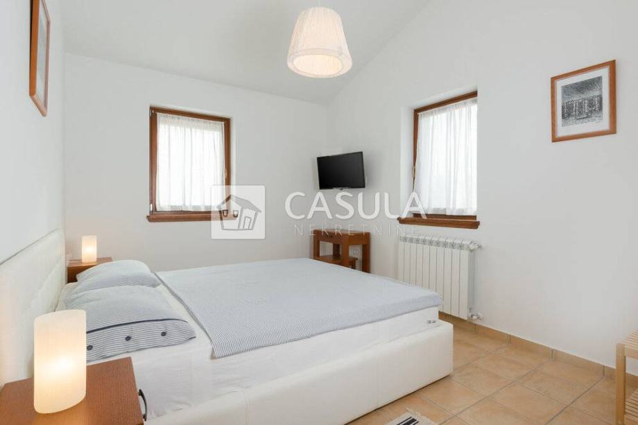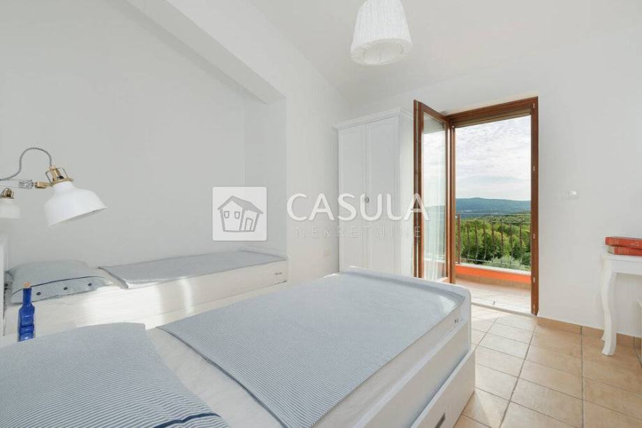 Prekrasno izgrađena kuća u blizini Rabca i Labina, s očaravajućim pogledom na stari grad. Kuća površine 162 m2 podijeljena je u dvije vertikalno usklađene jedinice, svaka od 81 m2. Ove praktične i dobro opremljene jedinice uključuju dnevni boravak, blagovaonicu i kuhinju na prizemlju, svaka s izlazom na natkrivenu terasu. Uključuju i kupaonicu i prostran prostor za skladištenje. Gornji katovi sastoje se od dvije spavaće sobe, kupaonice i terase.