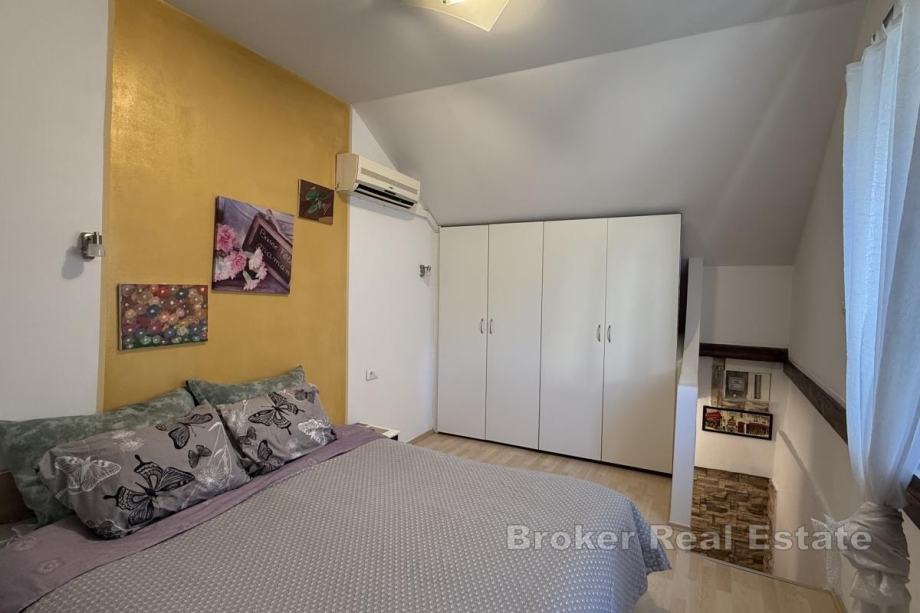 Spiralne stepenice iz dnevnog boravka vode u komfornu spavaću sobu, dok druge stepenice iz kuhinje vode u drugu spavaću sobu. Zbog rasporeda