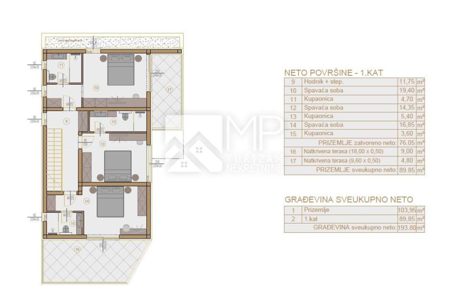 Luksuzno stubište vodi na I. kat gdje su se smjestile 3 komforne spavaće sobe ( od kojih dvije imaju izlaz na svoju terasu ), svaka sa pripadajućim kupaonicama, što dodatno pruža privatnost za buduće članove.