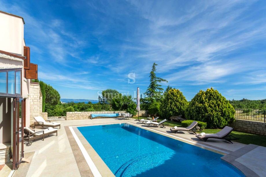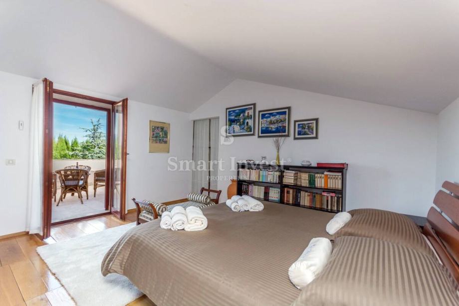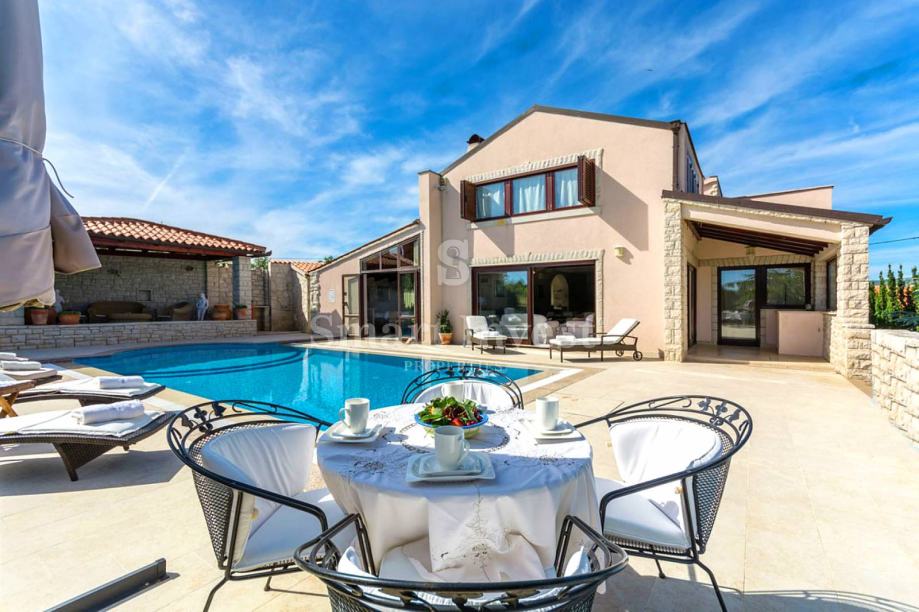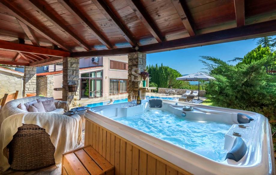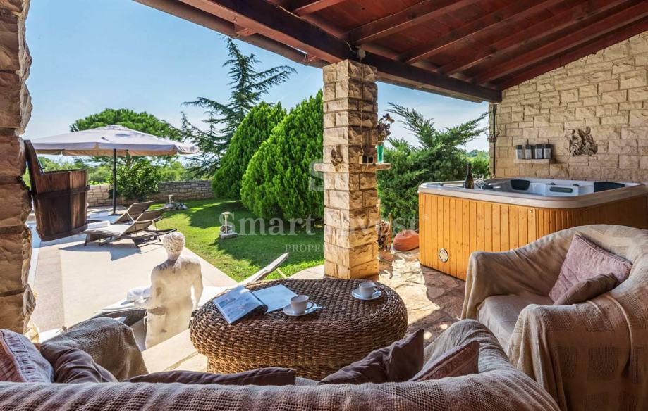 Okućnica je u kompletno ograđena i lijepo uređena. Ovdje se nalazi prostrana terasa s lounge prostorom i roštiljem, grijani bazen od 40 m2 sa slanom vodom i funkcijom protustrujnog plivanja, sauna koja zaokružuje priču zone za relaksaciju.