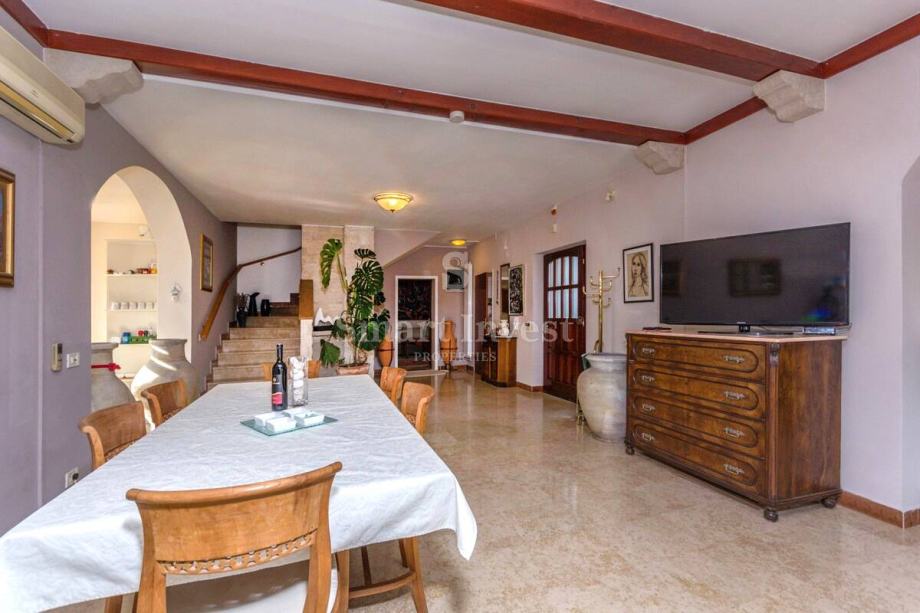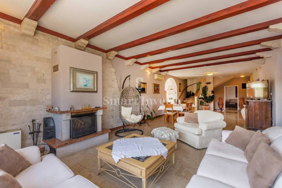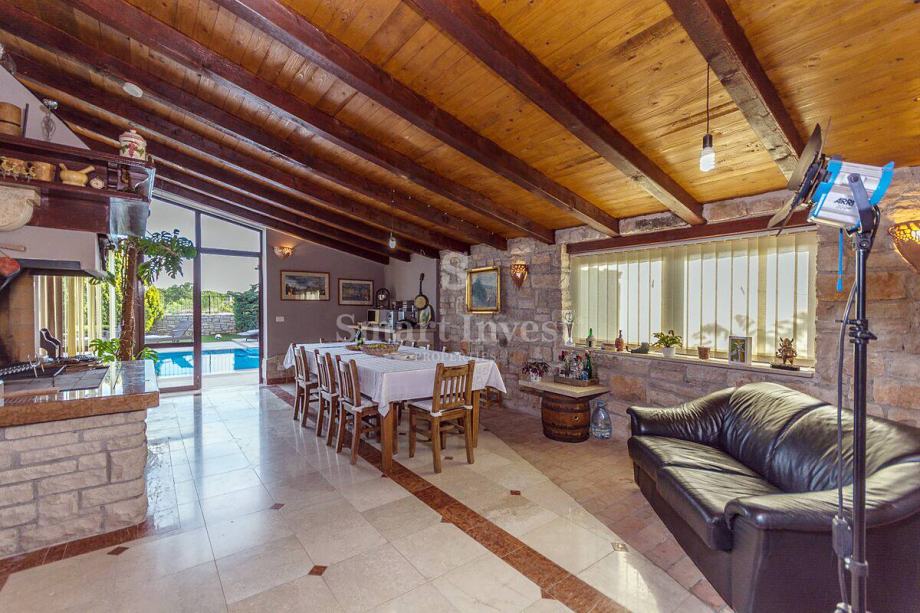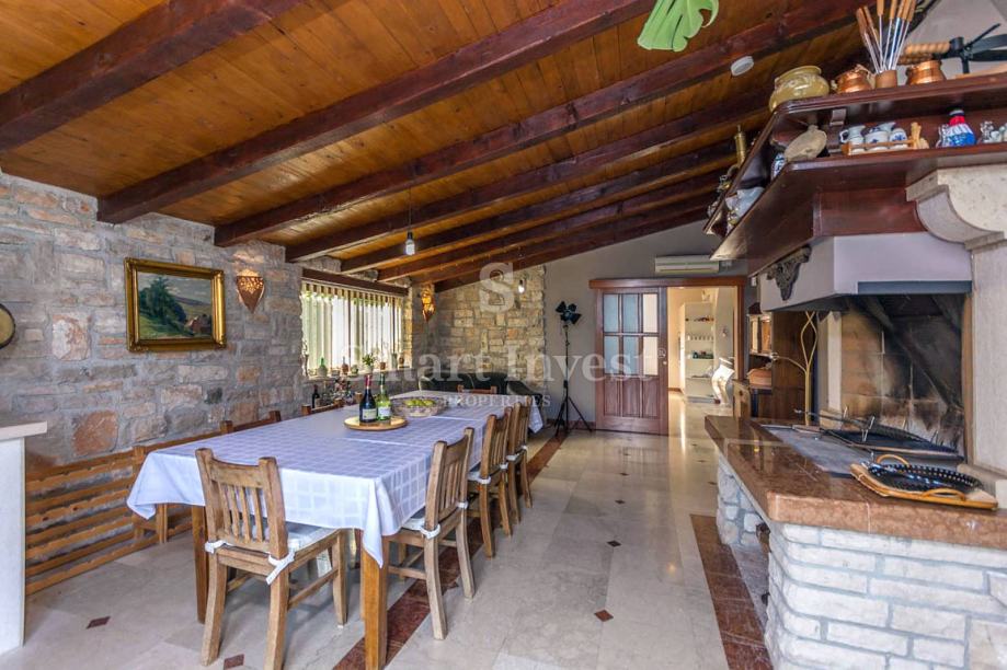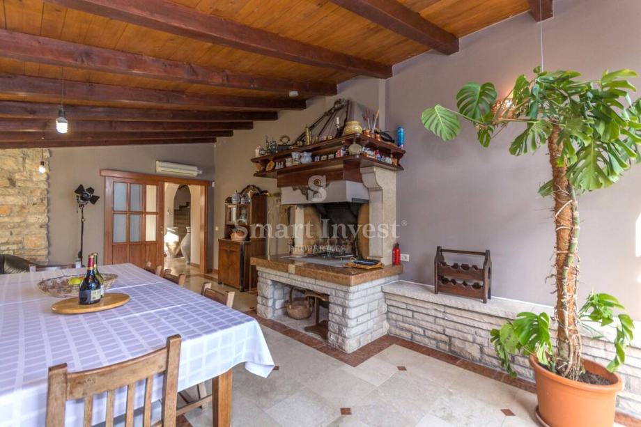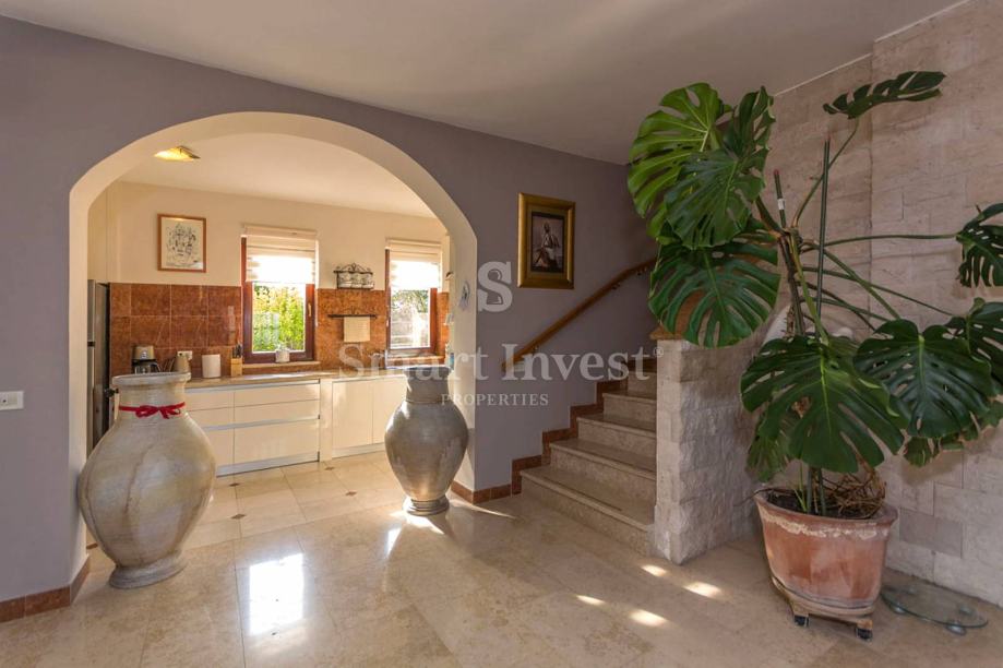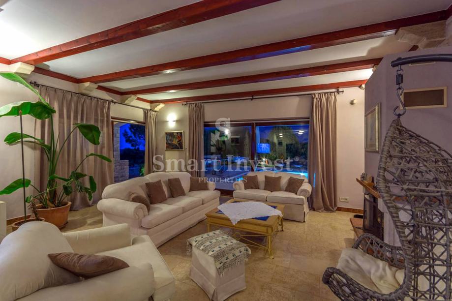 Sastoji se prostranog dnevnog boravka sa predivnim kaminom i velikim staklenim stijenama koje osiguravaju lijepi pogled, kuhinje i velike blagovaonice, 4 spavaće sobe, 3 kupaonice, prostrane radne sobe (koja može biti pretvorena u još jednu spavaću sobu), toaleta, ostave. U prizemlju se nalazi i lijepo uređena konoba s otvorenim ognjišćem za druženje.