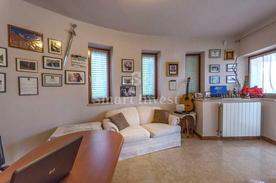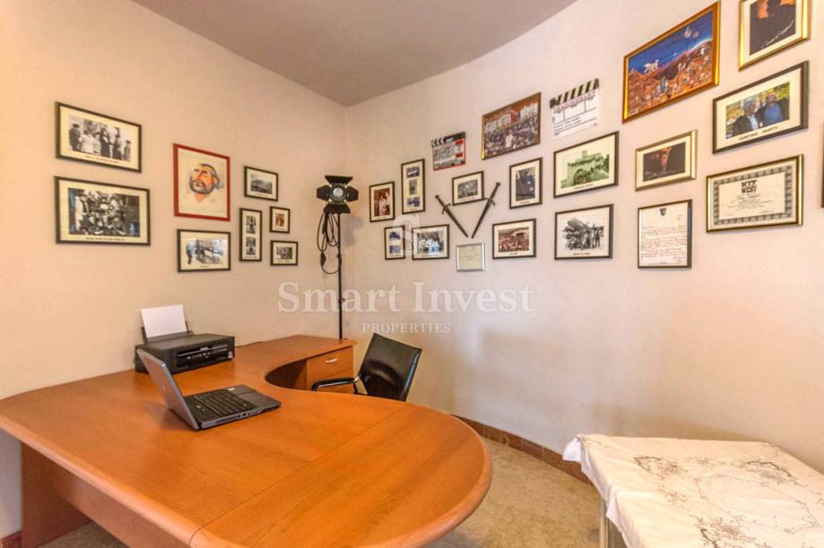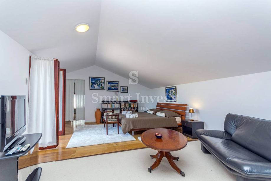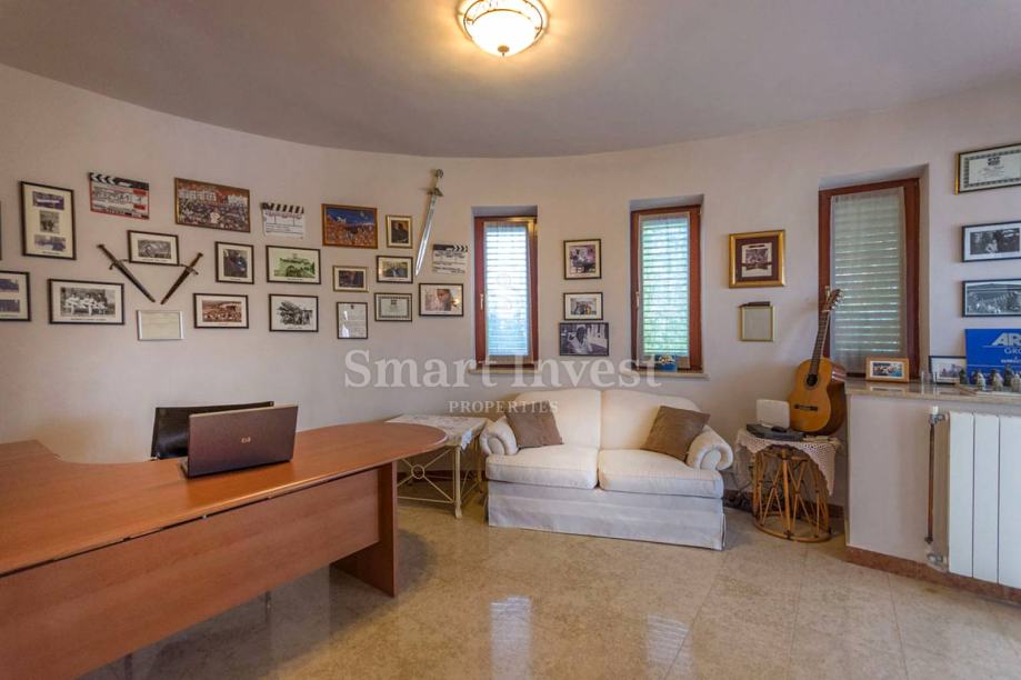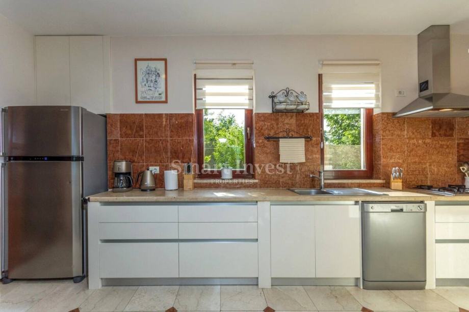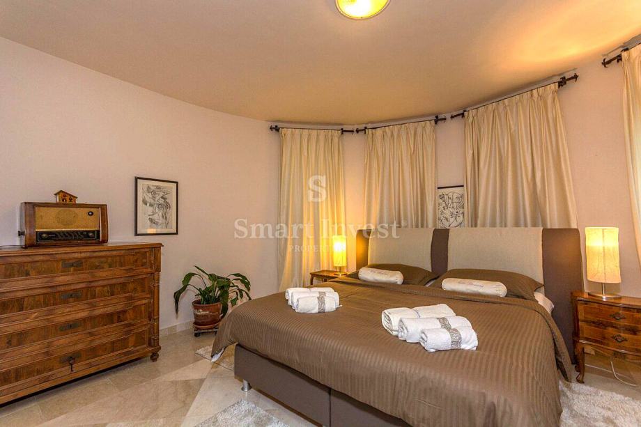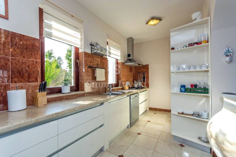 Sastoji se prostranog dnevnog boravka sa predivnim kaminom i velikim staklenim stijenama koje osiguravaju lijepi pogled, kuhinje i velike blagovaonice, 4 spavaće sobe, 3 kupaonice, prostrane radne sobe (koja može biti pretvorena u još jednu spavaću sobu), toaleta, ostave. U prizemlju se nalazi i lijepo uređena konoba s otvorenim ognjišćem za druženje.