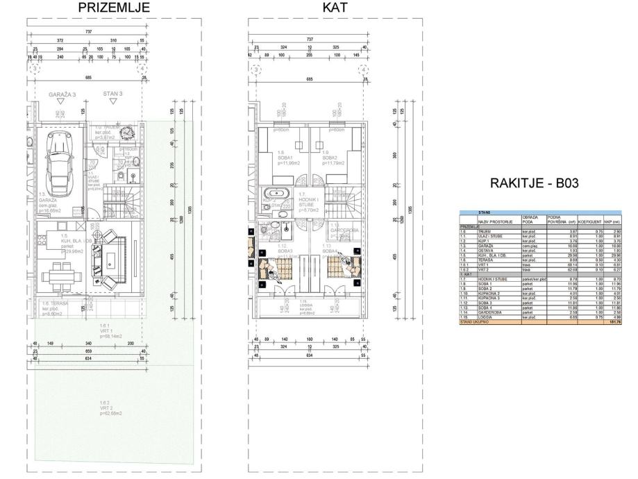 Kuća oznake B03 je površine - stambena površina 109,83n2, vrta 130,82m2, natkrivene terase 8,60m2, ulaznog trijema 3,87m2, lođe 6,65m2, garaže od 16,66m2 i vanjskog parkirnog mjesta od 12,50m2, ukupne prodajne površine 150,72m2.