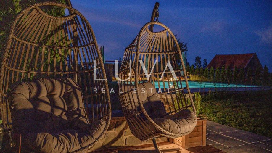 Nekretnina raspolaže s četiri prostrane spavaće sobe i dvije moderne kupaonice, a naglasak je stavljen na opuštanje i uživanje. Poseban doživljaj pruža grijani bazen i sauna, idealni za cjelogodišnje korištenje. Prostrani interijer uređen je u toplom, modernom stilu, dok dvije garaže i dodatna parkirna mjesta osiguravaju praktičnost i komfor.