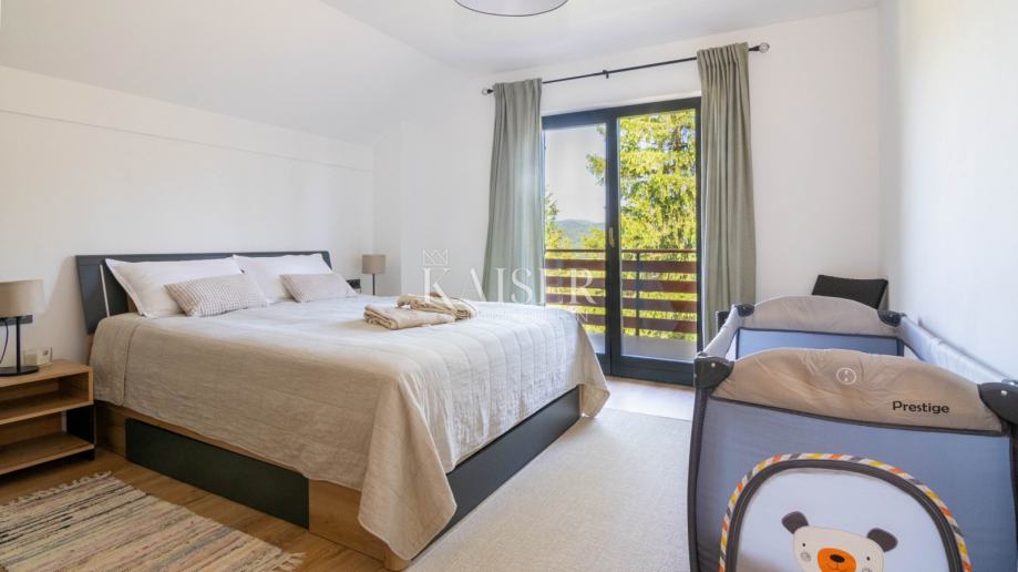 U srcu goranske prirode, u mirnom i uređenom mjestu Ravna Gora, smjestila se ova moderna planinska kuća izgrađena 2023. godine – dom koji već na prvi pogled osvaja toplinom, skladom i posebnom pozitivnom energijom. Okružena zelenilom i smještena na nadmorskoj visini od oko 800 metara, kuća nudi prekrasan pogled na okolne livade i šume, stvarajući osjećaj mira, svježine i povezanosti s prirodom u svako godišnje doba.