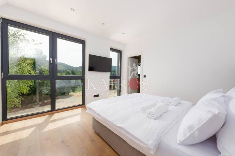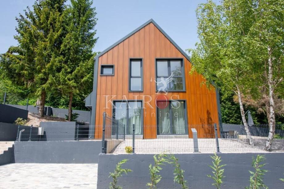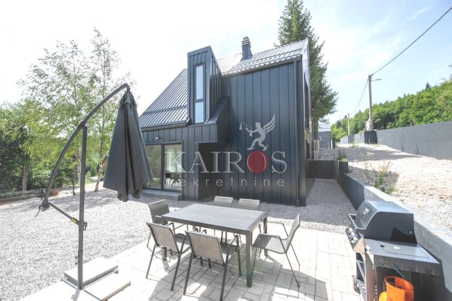 RAVNA GORA, villa površine 100 m2, sa 465 m2 ograđene okućnice s prostorom za parking, smještena u prelijepom zelenom krajoliku Gorskog Kotara. Sastoji se od dnevnog boravka s kuhinjom i blagovaonicom ("open space"), dvije spavaće sobe (s vlastitim kupaonicama), hodnika, wc-a, terase, spremišta i saune. Sve je kompletno namješteno i tako se i prodaje. Kuća je kategorizirana (uhodan posao). Na vanjskom prostoru kuće nalazi se garnitura za sjedenje s velikim suncobranom i s pokretnim roštiljem.