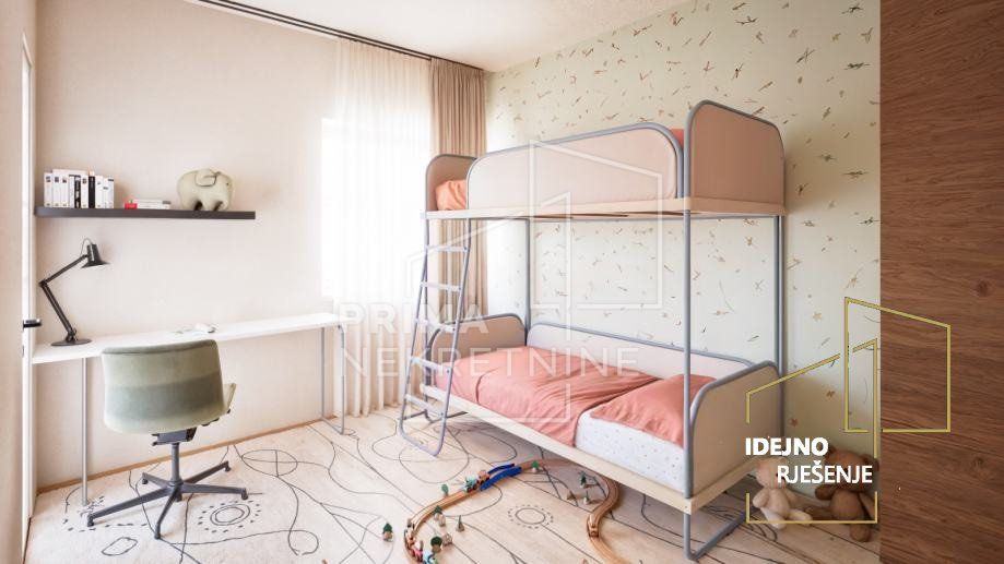 Sastoji se od ulaznog prostora i hodnika (14,62 m2), dnevnog boravka i blagovaonice (22,14 m2), kuhinje (10,86 m2), spavaće sobe 1 (12,29 m2), spavaće sobe 2 (12,76 m2), spavaće sobe 3 (9,21 m2), kupaonice s WC-om 1 (5,29 m2), kupaonice s WC-om 2 (3,20 m2), balkon (3,19 m2), loggia 1 (2,97 m2), loggia 2 (3,19 m2) i spremište na -1 etaži (2 m2).