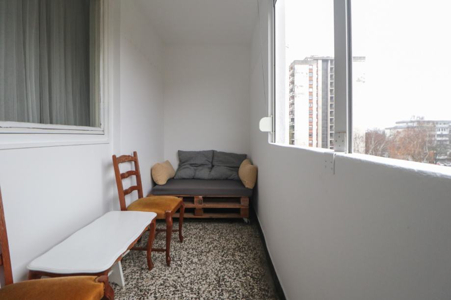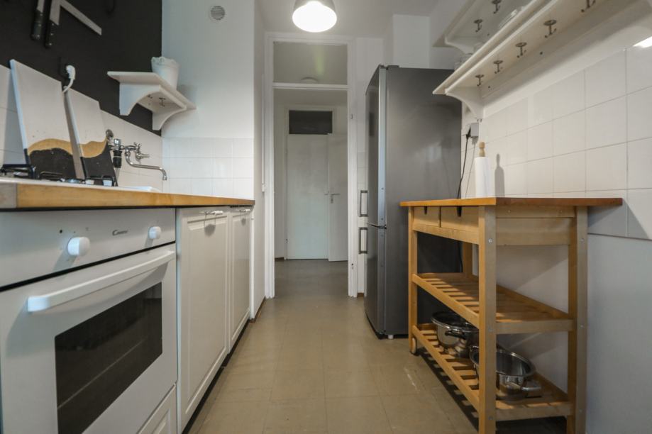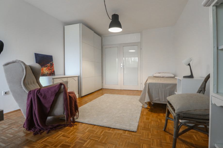 Stan je površine 65 m2, potpuno je čist i lijepo uređen. Svjetao je i topao jer je orijentiran na zapad. Svaka prostorija je lijepe veličine, a raspored stana se po potrebi može i promijeniti (sada stan idealno funkcionira za dva cimera-sobe su namještene krevetime, ormarima i radnim stolom i stolicom, a po potrebi se jednu sobu može prenamijeniti u dnevni boravak).