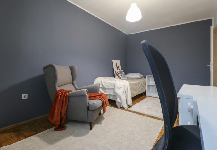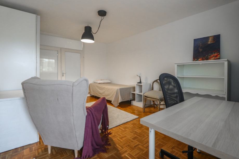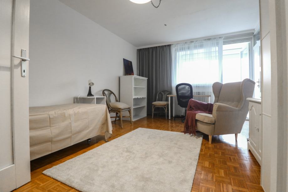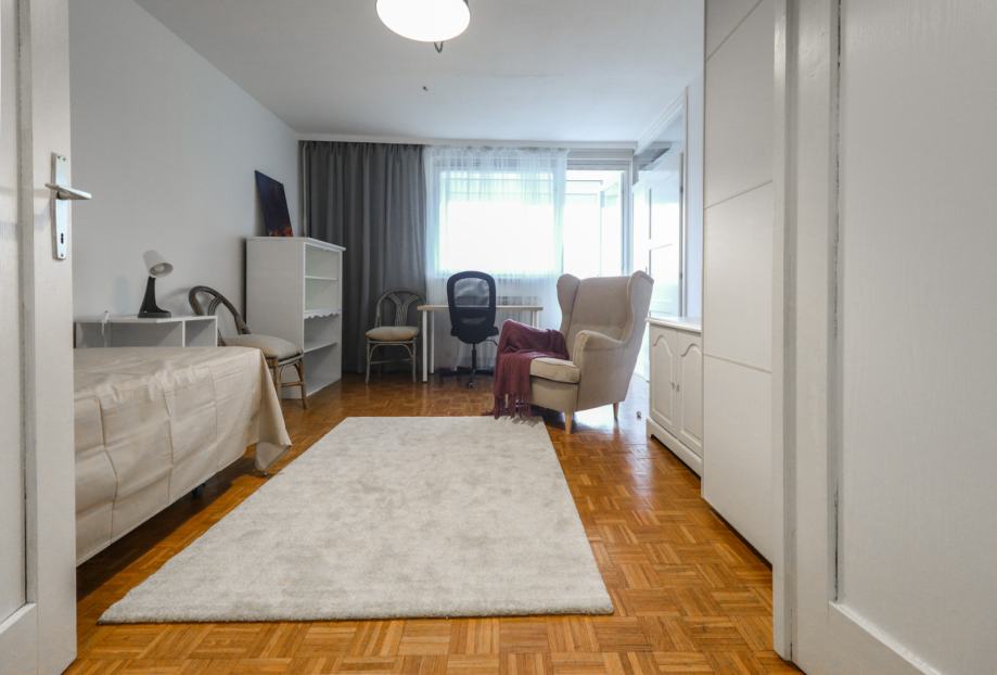 Stan je površine 65 m2, potpuno je čist i lijepo uređen. Svjetao je i topao jer je orijentiran na zapad. Svaka prostorija je lijepe veličine, a raspored stana se po potrebi može i promijeniti (sada stan idealno funkcionira za dva cimera-sobe su namještene krevetime, ormarima i radnim stolom i stolicom, a po potrebi se jednu sobu može prenamijeniti u dnevni boravak).