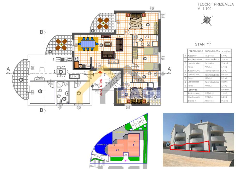 Prodaje se STAN 1 u prizemlju neto površine 119,77m2 sa 3 spavaće sobe i 2 kupaonice, dnevnim boravkom s kuhinjom i blagovaonicom. Površina samo stambenog područja iznosi 87,79 m2. Također stanu pripadaju 3 terase, jedna od 7,47 m2, druga natkrivena terasa oznake 13 površine 2,97 m2 i treća natkrivena terasa oznake 15 površine 8,49 m2. Vrt iznosi 102,61 m2.