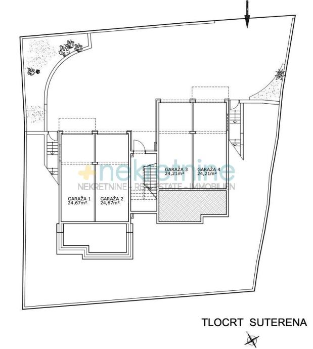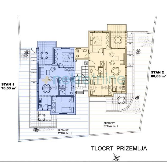 - **Prizemlje:** Dva dvosobna stana s pripadajućim vrtovima
