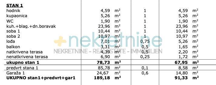Stan S1 površine 91 m2, se sastoji od kupaone, wc-a, dvije spavaće sobe, dnevnog boravka sa kuhinjom i blagavaonom, sa izlaskom na natkrivenu i nenatkrivenu terasu, koja je u komunikaciji sa velikim prostranim vrtom površine 85 m2. Stanu pripada velika prostrana garaža u suterenu objekta, površina garaže iznosi 24.67 m2.