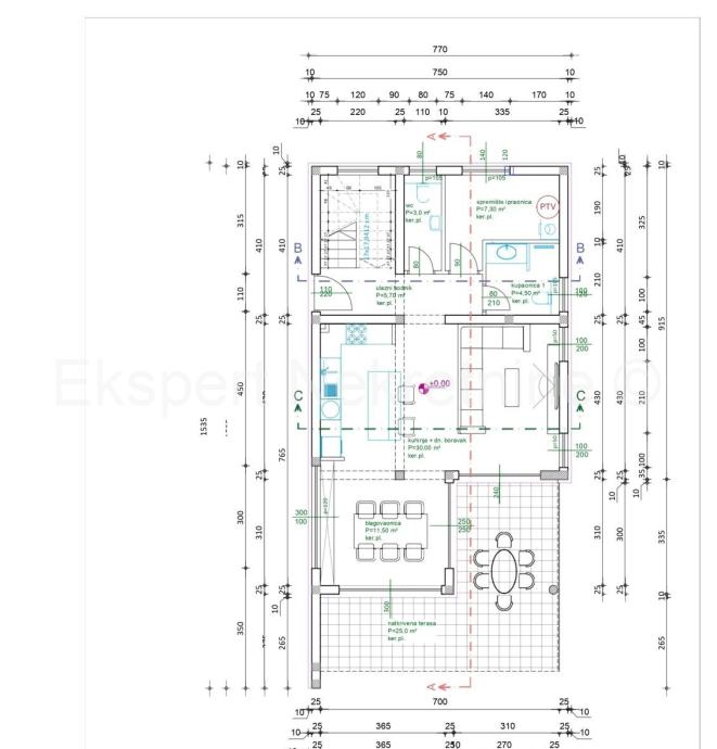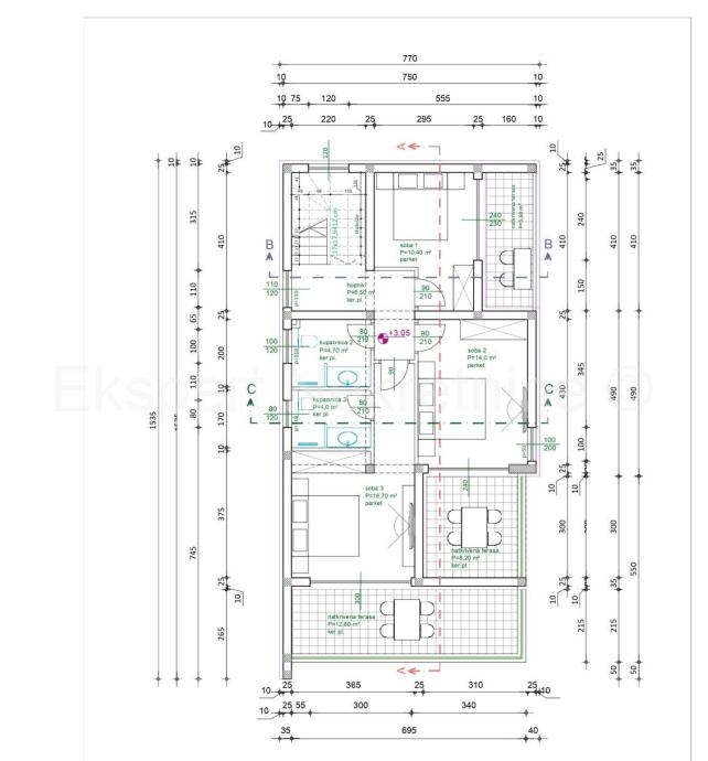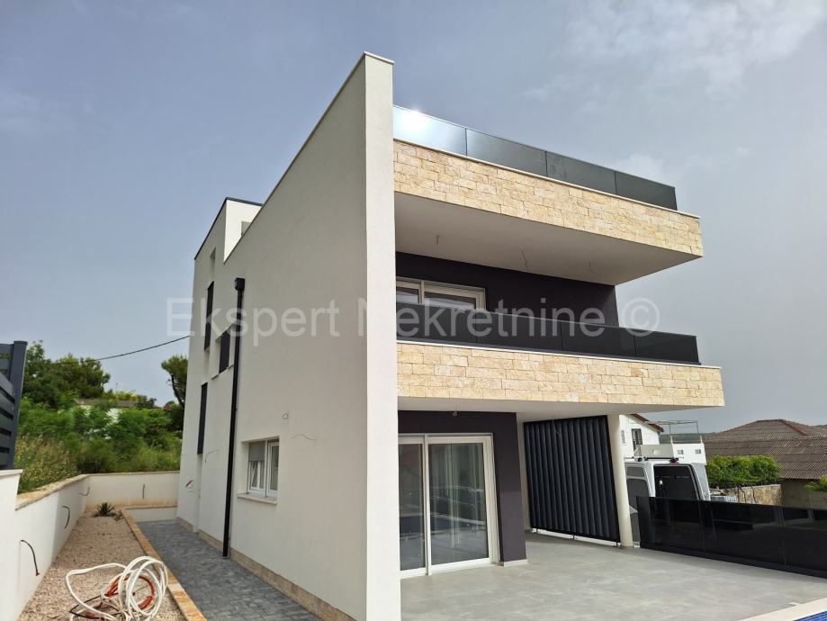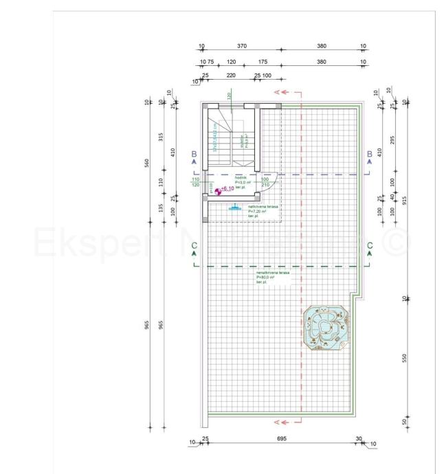 Prizemlje se sastoji od hodnika, WC, spremišta i praonice, kupaonica 1, kuhinja + dnevni boravak, blagavaonica sa izlazom na natkrivenu terasu.Dvokrakim stubištem dolazi se do kata na kojem se nalazi hodnik, soba 1, soba 2, soba 3, kupaonica 2, kupaonica 3, i 3 natkrivene terase na koje se izlazi iz svake sobe zasebno.
