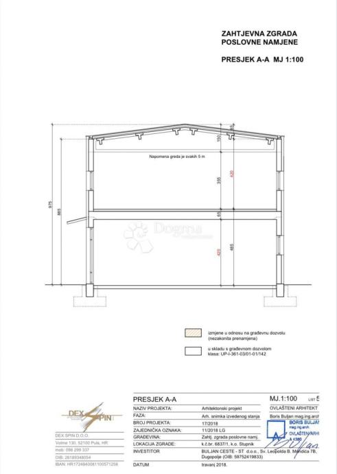 U prizemlju se nalazi cca 607 m² skladišnog prostora podijeljenog u četiri međusobno povezane cjeline s tri rolo ulaza, uredski dio te sanitarni čvorovi. Na katu je dodatnih cca 548 m² skladišta te stambeno-uredski prostor od cca 90 m² (3 sobe, 3 kupaonice, kuhinja i dnevni boravak) s kapacitetom do 10 radnika. Etaže su povezane stepeništem i teretnim dizalom nosivosti 1.500 kg.