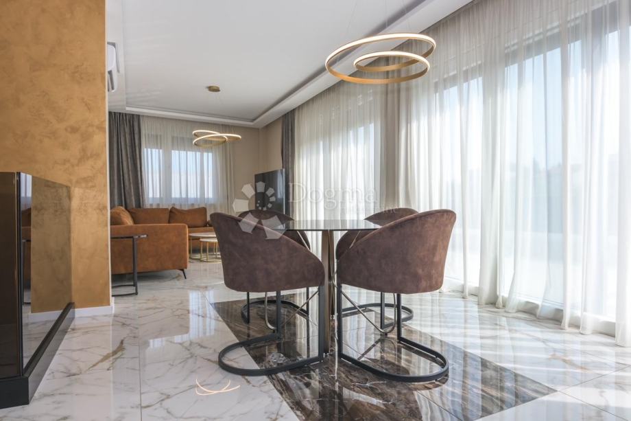stubište -galerija ,prostran dnevni boravak s ogromnom terasom , kuhinja sa svim kućanskim aparatima , smart -home sustav, video portafon , električni sistem roleta,svi luksuzni materijali vrhunske kvalitete u opremanju ,stolarija,mramor, kaljeno staklo,parket troslojni ( podno grijani),najmodernija tehnika ručnog oslikavanja zidova +podovi epoxy,indirektna luksuzna rasvjeta ,prvoklasna keramika villeroy&boch,protuprovalna vrata