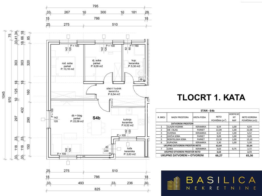 Stan oznake 1S4B - trosoban, nalazi se na 1. katu te se sastoji od: dnevnog boravka sa kuhinjom i blagovaonicom, dvije sobe, kupaonice, lođe i vanjskog parkirnog mjesta. Ukupna prodajna površina je 68,49m2.