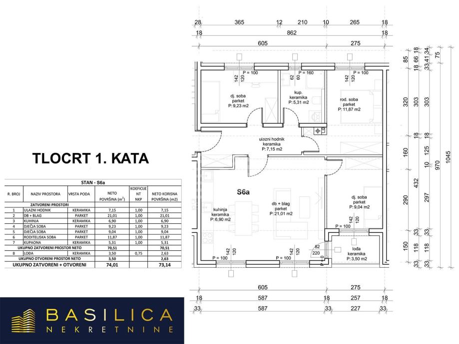 Stan oznake 2S6A - četverosoban, nalazi se na 1. katu te se sastoji od: dnevnog boravka sa kuhinjom i blagovaonicom, tri sobe, kupaonice, loggie i vanjskog parkirnog mjesta. Ukupna prodajna površina je 76,26m2.