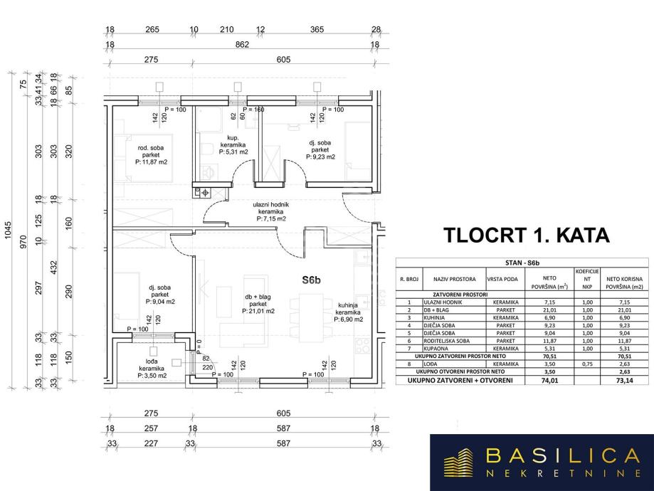Stan oznake 2S6B - četverosoban, nalazi se na 1. katu te se sastoji od: dnevnog boravka sa kuhinjom i blagovaonicom, tri sobe, kupaonice, loggie i vanjskog parkirnog mjesta. Ukupna prodajna površina je 76,26m2.