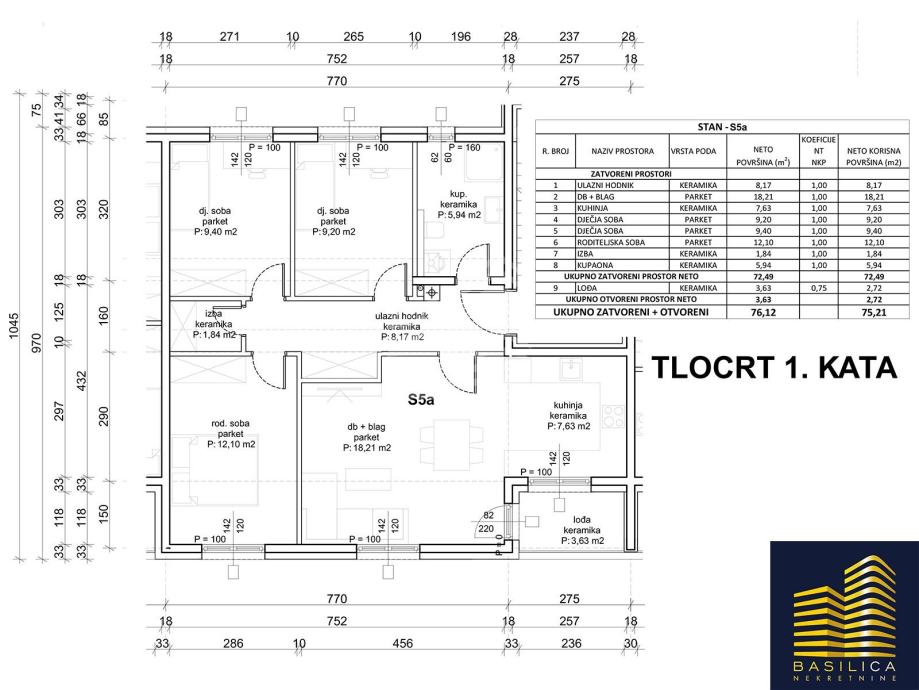 Stan oznake 2S5A - četverosoban, nalazi se na 1. katu te se sastoji od: dnevnog boravka sa kuhinjom i blagovaonicom, tri sobe, kupaonice, izbe, lođe i vanjskog parkirnog mjesta. Ukupna prodajna površina je 78,34m2.