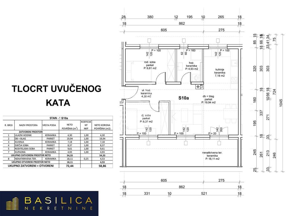 Stan oznake 2S10A - trosoban, nalazi se na 2. katu te se sastoji od: dnevnog boravka sa kuhinjom i blagovaonicom, dvije sobe, kupaonice, terase i vanjskog parkirnog mjesta. Ukupna prodajna površina je 61,98m2.