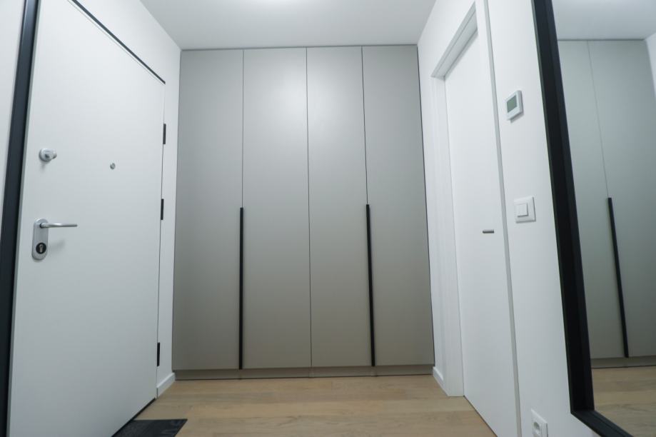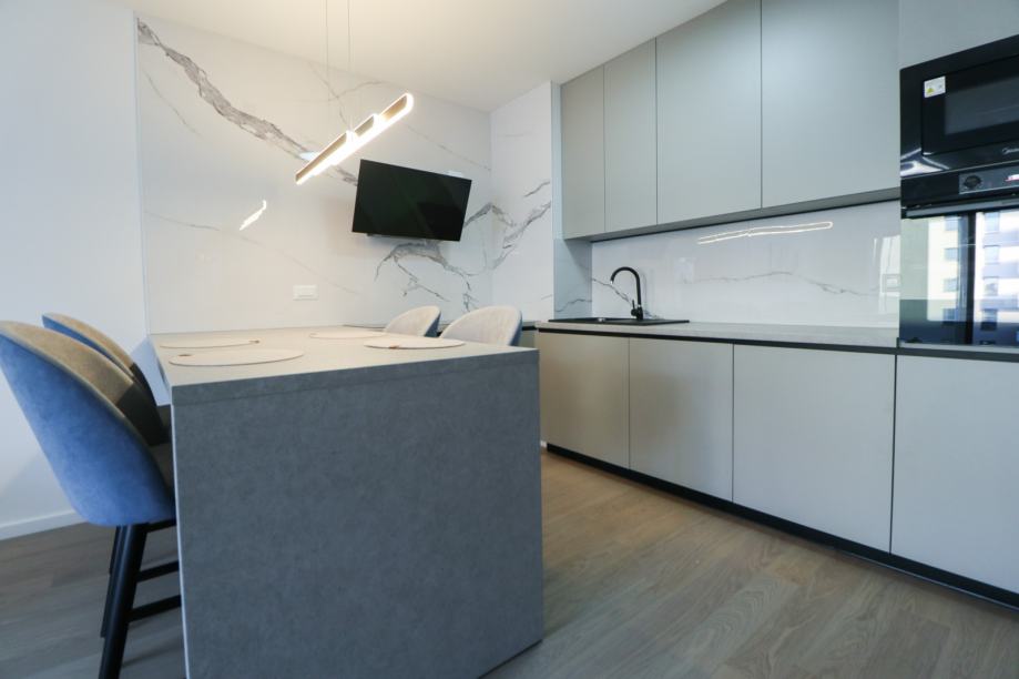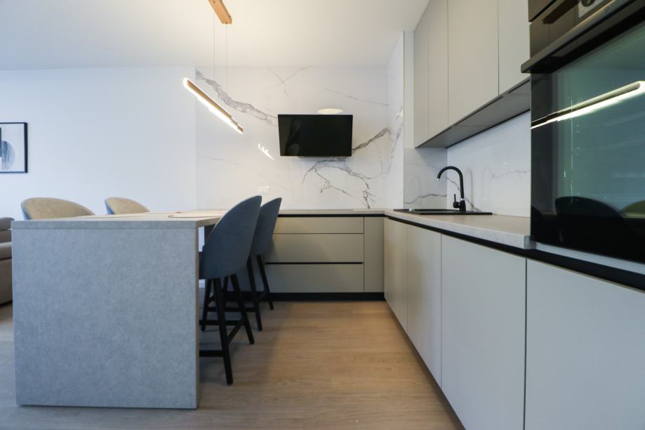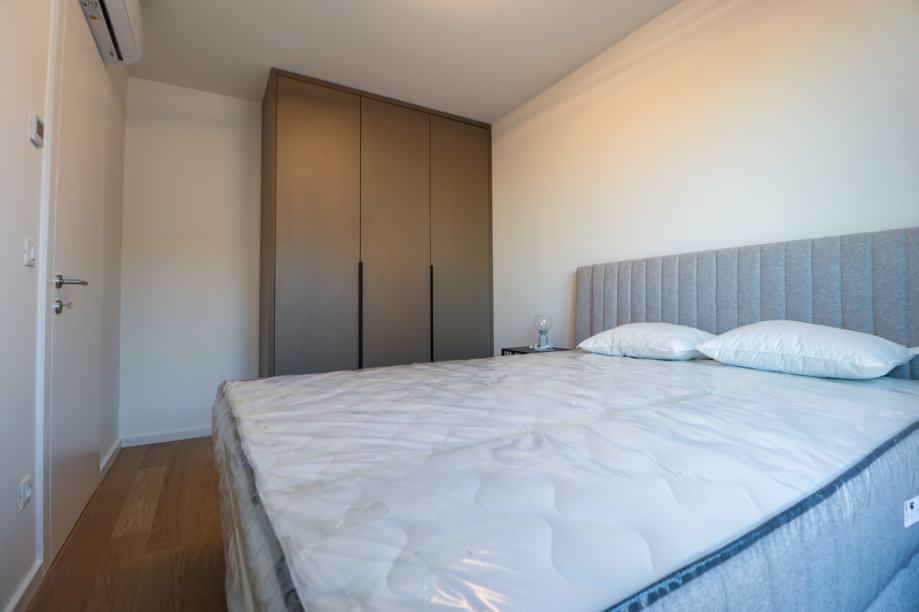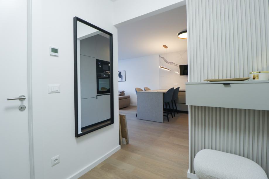 Sve u stanu je novo i svi materijali su visokokvalitetni. Opremljen je PVC stolarijom s trostrukim IZO staklom i aluminijskim roletama na motorni pogon, protuprovalnim vratima, TV-om, električnim roletama. Potpuno opremljena moderna kuhinja s kuhinjskim stolom. Inverterska dizalica topline, podno grijanje i klimatizacija.