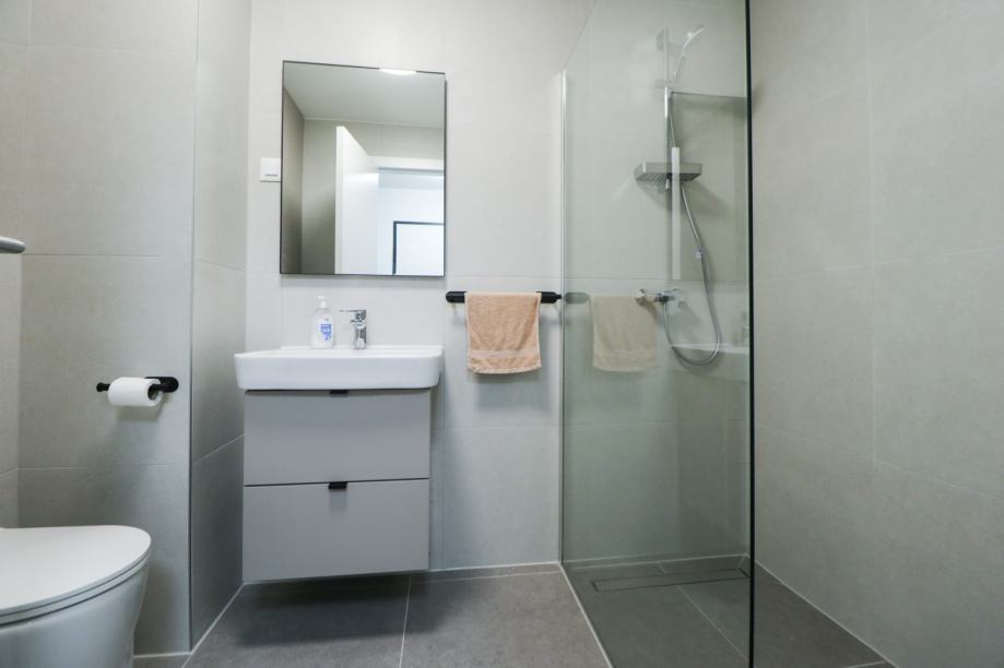 Stan ima ukupnu površinu od 56,17m2, a sastoji se od ulaznog hodnika, open space dnevnog boravka s kuhinjom i blagovaonom, spavaće sobe, kupaonice s walk-in tuš kabinom i toaletom te prekrasnog balkona.
