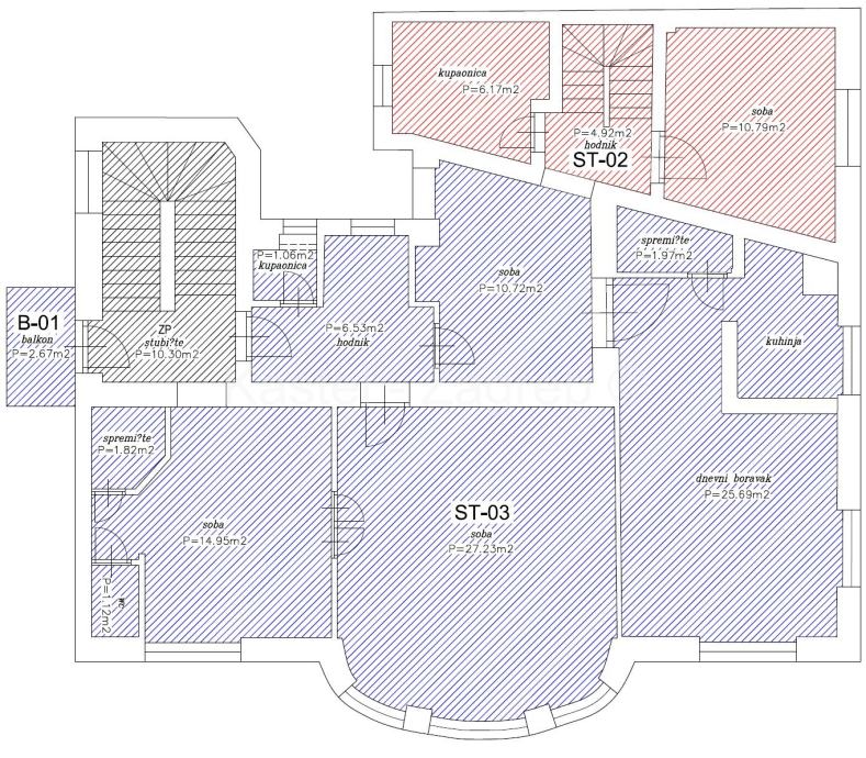 stan na katu u tlocrtu oznake ST-03 koji se sastoji od: dnevnog boravka, tri sobe, kuhinje, kupaonice, WC-a, dva spremišta i hodnika ukupne pov. 91,01 m2, sa balkonom oznake pov. 2,67 m2 te pripatka spremišta u podrumu zgrade pov. 13,73 m2 . Stanovi se prodaju isključivo zajedno. Uredna dokumentacija