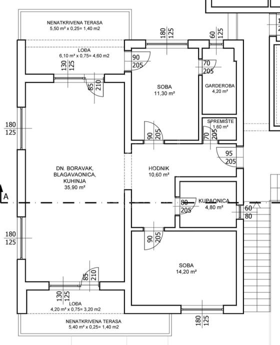 Nalazi se na 1. katu do kojeg se dolazi vanjskim stubištem i sadrži: hodnik, kuhinju s blagovaonicom i dnevnim boravkom, dvije spavaće sobe od kojih veća ima walk in ormar, kupaonicu, ostavu i dva balkona (istočna i zapadna strana).