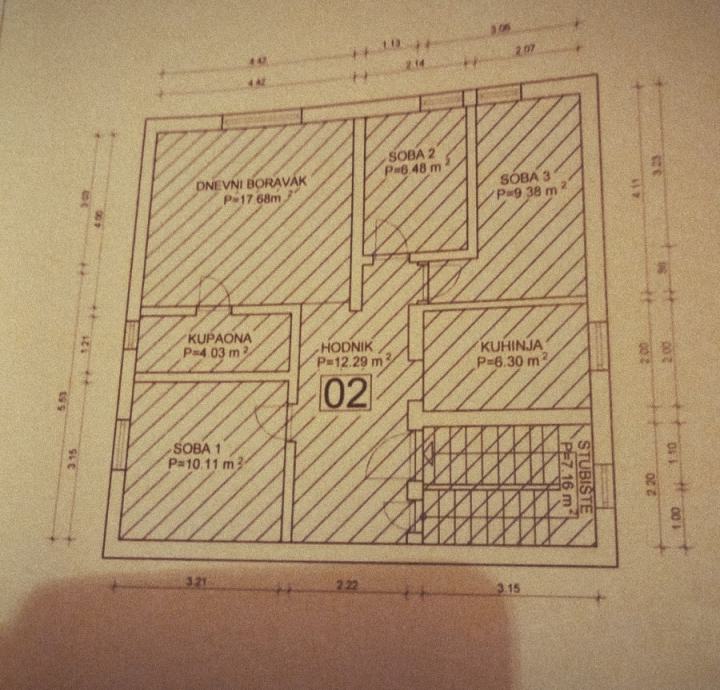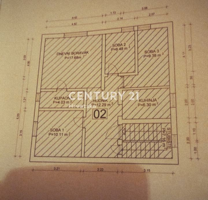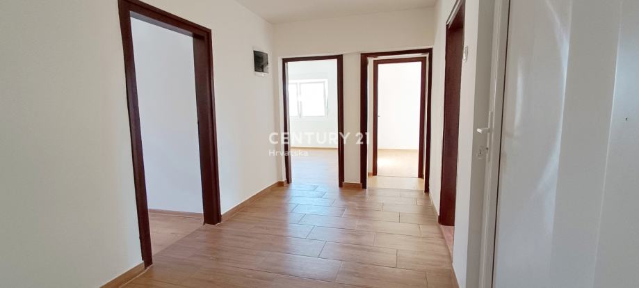 Stan se sastoji od tri spavaće sobe, dnevnog boravka, kuhinje, kupaonice, ostave i hodnika.