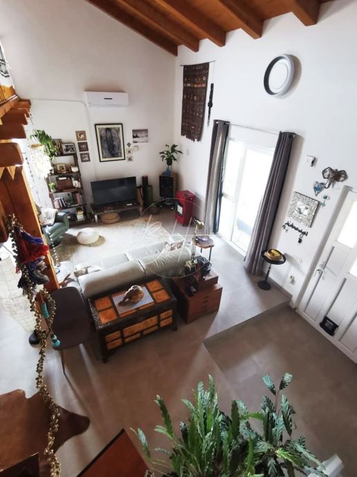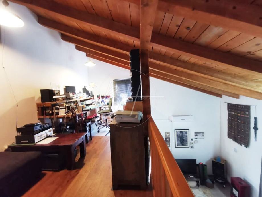 Prostrani dnevni boravak s blagovaonicom (43 m²) ima visoke stropove, a drveno stepenište vodi na galeriju od 17,5 m² koja trenutno služi kao ured, ali se lako može pretvoriti u dodatnu sobu. Ostatak kuće čine odvojena, potpuno opremljena kuhinja, kupaonica i dvije svijetle spavaće sobe s visokim stropovima.