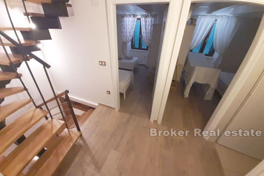 Na katu se nalaze dvije spavaonice i kupaonica a ova etaža ima i pripadnu veliku terasu sa ugrađenim jacuzzijem i malom ljetnom kuhinjom.