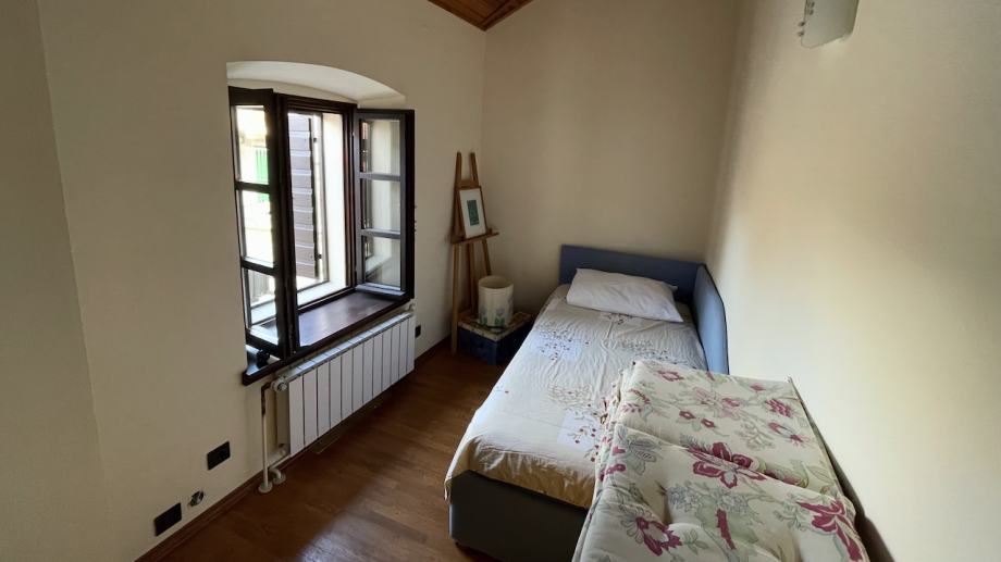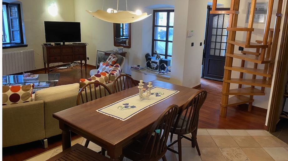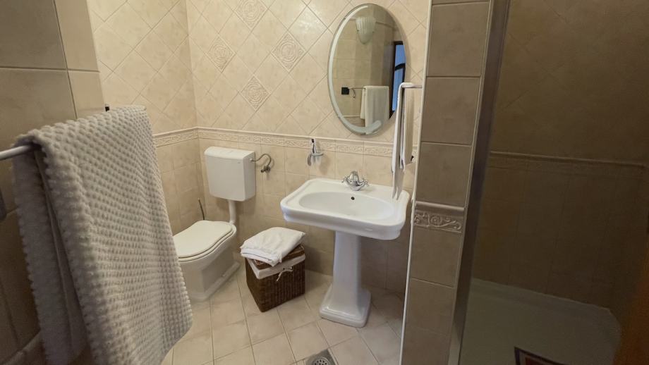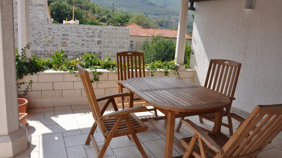 Stepenice vode na terasu prvog kata i dalje u stan, čiji najveći dio čini dnevna soba s kuhinjom i blagovaonicom. Tu su još kupaonica s tušem i ostava-praonica. Do gornje etaže, gdje se nalaze 3 spavaće sobe i elegantna kupaonica, može se doći unutarnjim drvenim stepenicama iz kuhinje ili vanjskim kamenim stepenicama, koje vode na prostrani trijem s očaravajućim pogledom, nudeći savršeno mjesto za opuštanje u hladovini.
