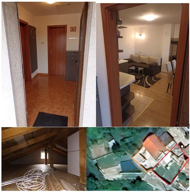 - stambeni kat cca 40 m² (dnevni boravak s kuhinjom, spavaća soba, kupaonica)