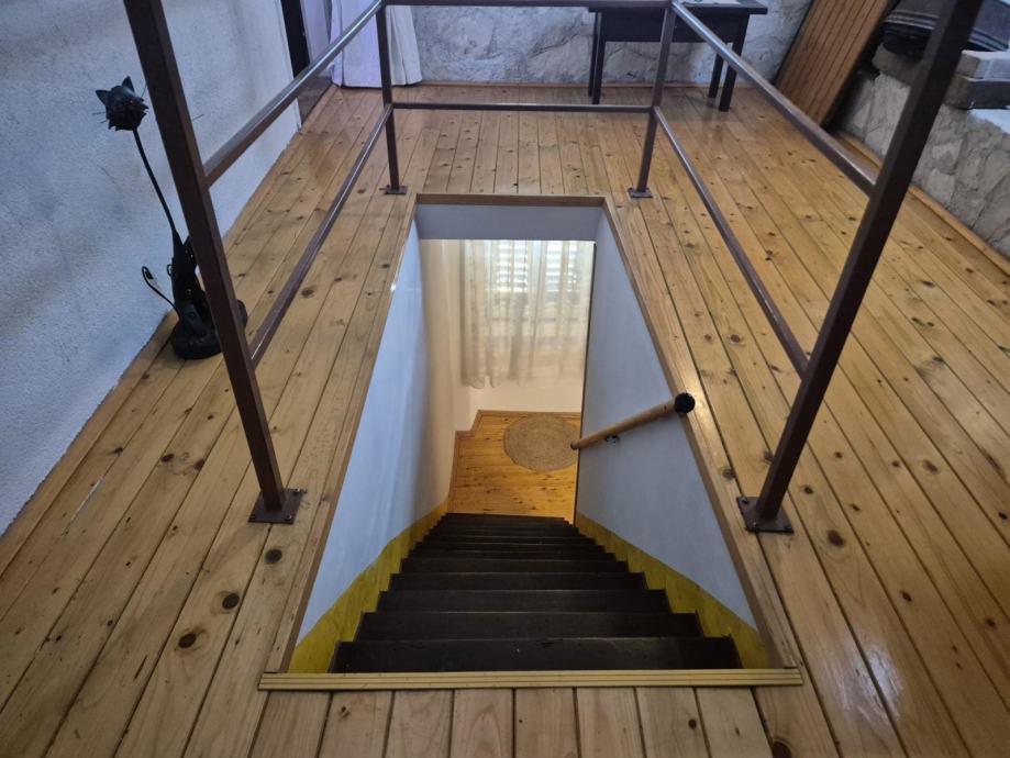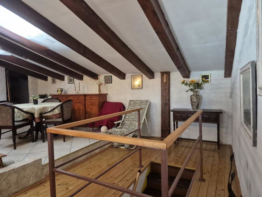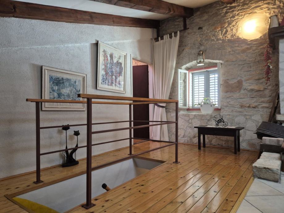 Na zadnjem katu nalazi se veći dnevni boravak s ognjištem (potpuno u funkciji), kuhinja, kupaonica, ostava, te odvojena soba s dodatnom ostavom.