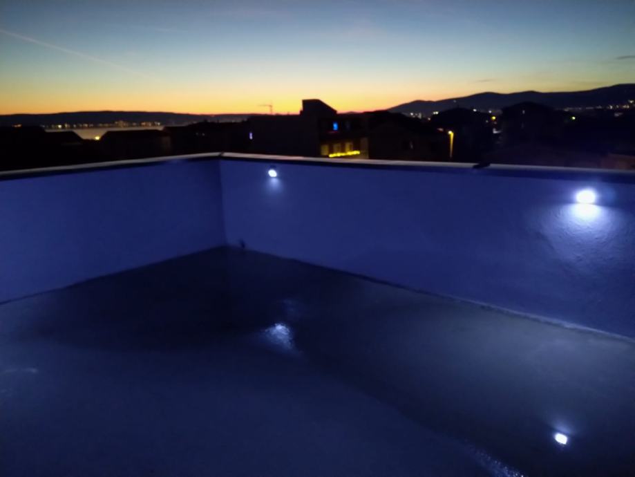Duž cijele kuće proteze se velika krovna terasa s koje se pruža prekrasan pogled na kaštelanski zaljev. Ista je može se iskoristiti za postavljanje jakuzia, sjedeće garniture, kamina i svega neophodnog za uživanje u predivom pogledu tijekom ljetnih večeri.