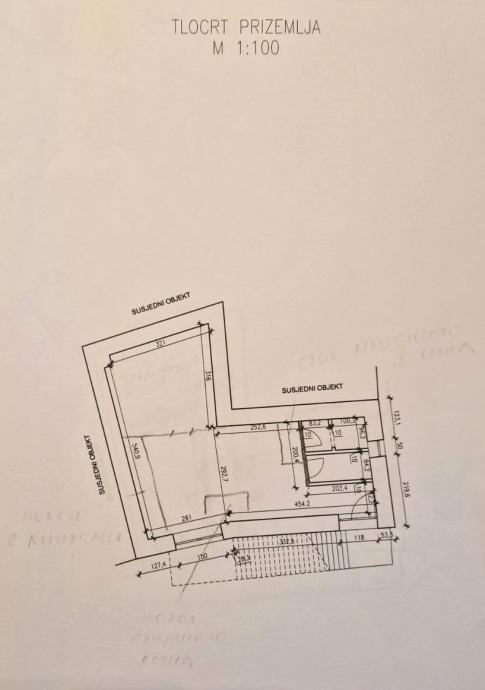 Kuća se proteže na 4 etaže. U prizemlju je manji studio apartman koji ima veliki "open space" prostor i kupaonicu, površine cca 36 m2.