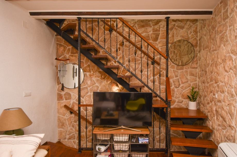 Vanjskim stepenicama se ide na prvu etažu otkud počinje gornji komforan stan površine cca 108 m2. Na toj prvoj etaži se smjestila prekrasno uređena kuhinja i kupaonica s kadom. Od tuda idu drvene stepenice na drugu etažu gdje se smjestio dnevni boravak i jedna spavaća soba, a na slijedećoj etaži je još jedna prostrana spavaća soba sa izlazom na teresu otkud se pruža pogled na šibenske straogradske krovove, crkve i more.