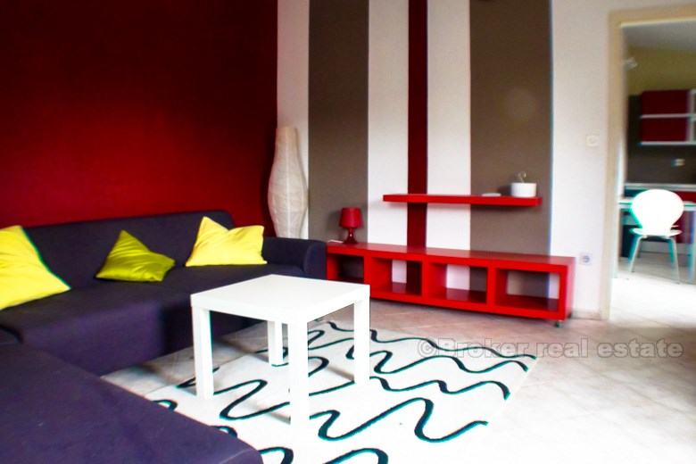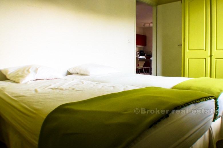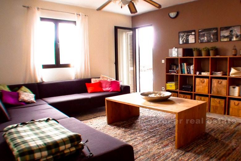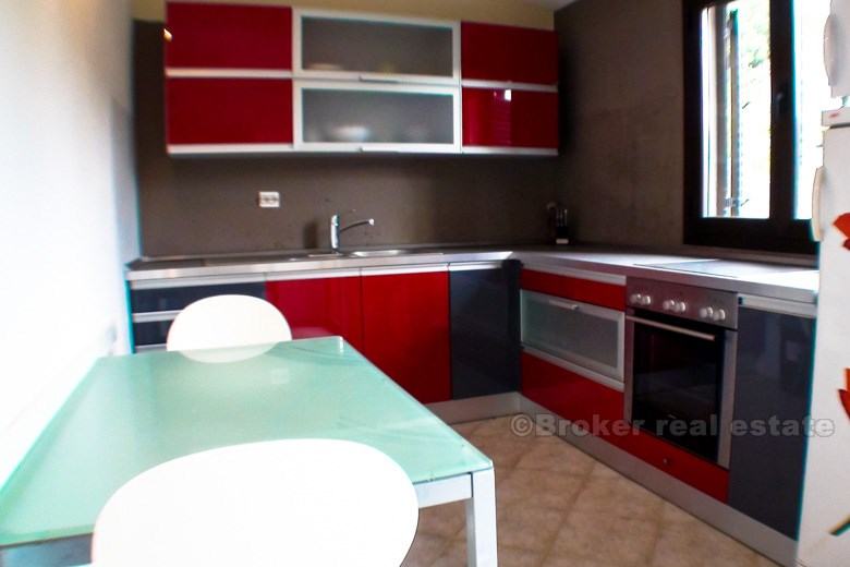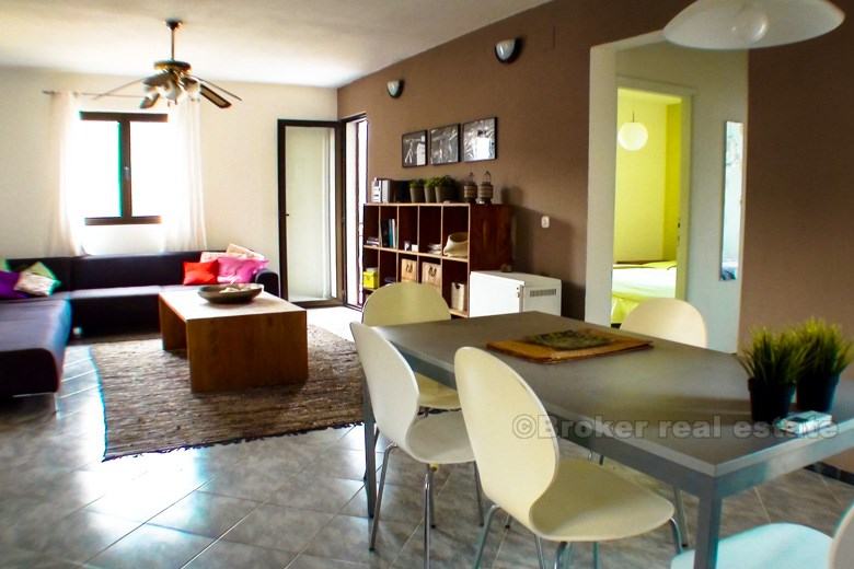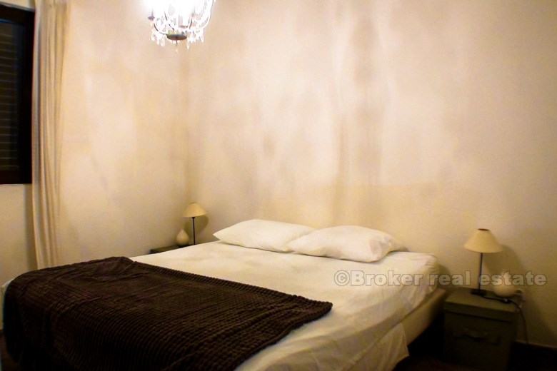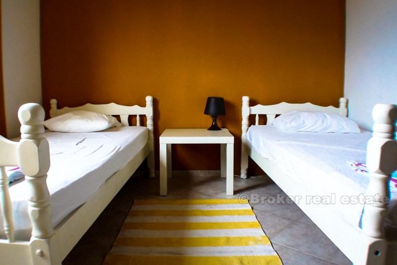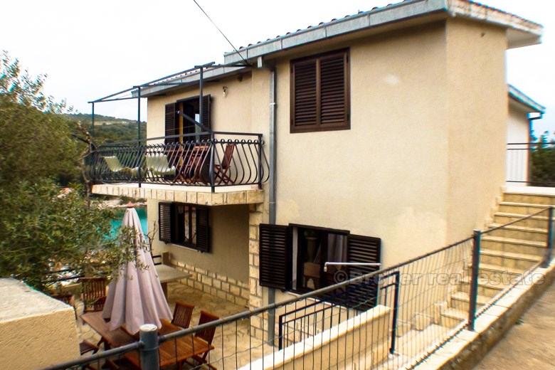 Kuća se sastoji od podruma i 2 kata, na svakom katu je jedan apartman. U prizemlju se nalazi velika terasa s roštiljem, a gornji kat ima balkon.