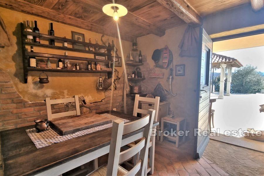 S prednje strane okućnice je prava zelena oaza sa stubištem pomoću kojeg se može pješke spustiti do mora za svega par minuta. Okućnica se sastoji od bazena, popločenog velikog sunčališta i natkrivena ljetna kuhinja.