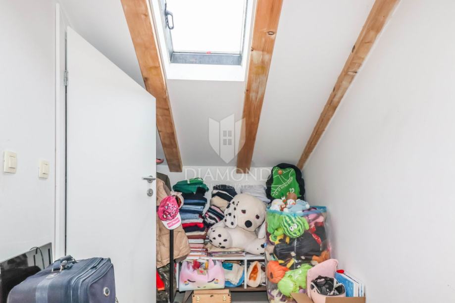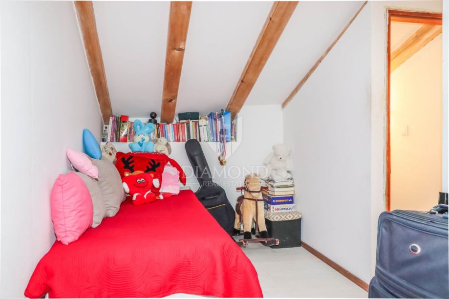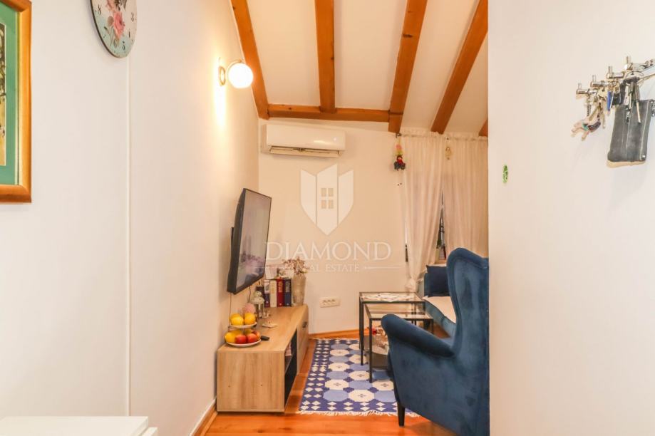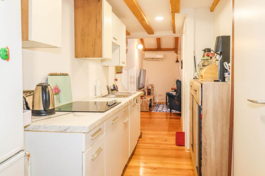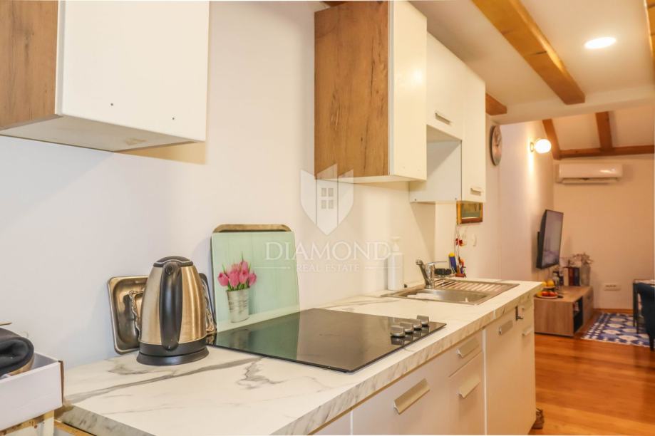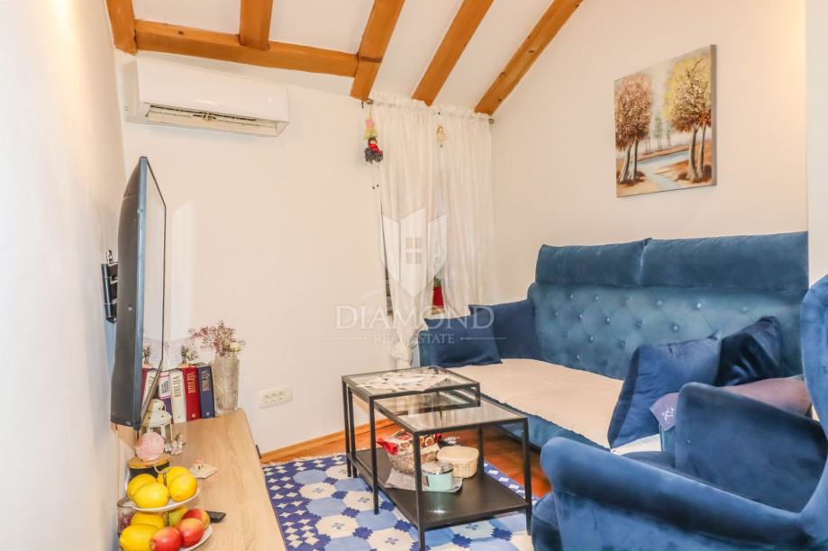 Stan se proteže na trećem katu i potkrovlju autentične kamene kuće te ima ukupnu površinu od 40 m². Prostor je pažljivo organiziran i maksimalno iskorišten, a sastoji se od dvije spavaće sobe, dvije moderne kupaonice, udobnog dnevnog boravka te funkcionalne kuhinje s blagovaonicom. Interijer odiše toplinom i stilom, s elegantnim detaljima i kvalitetnim materijalima koji stvaraju ugodnu atmosferu.