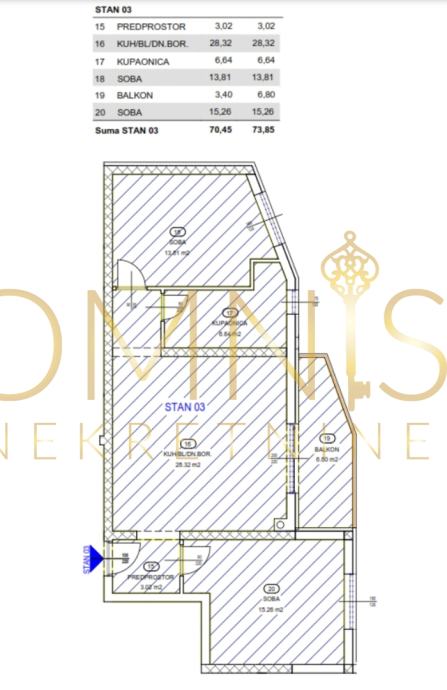 Prodaje se stan ukupne površine 73,85 m2 na 1. katu.