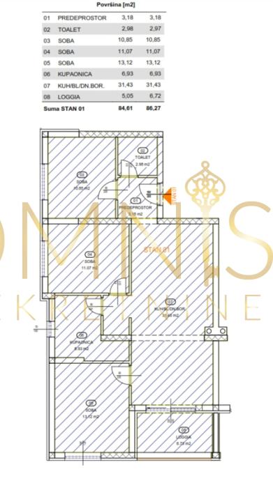 Prodaje se stan ukupne površine 86,27 m2 na 1. katu.